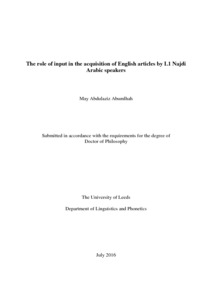 Abumlhah, May Abdulaziz (2016) The role of input in the acquisition of English articles by L1 Najdi Arabic speakers. PhD thesis, University of Leeds.