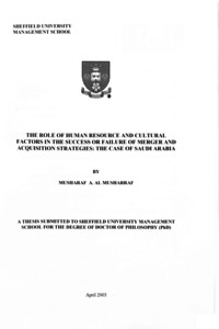 Al Musharraf, Musharaf A (2003) The role of human resource and cultural factors in the success or failure of merger and acquisition strategies : the case of Saudi Arabia. PhD thesis, University of Sheffield.